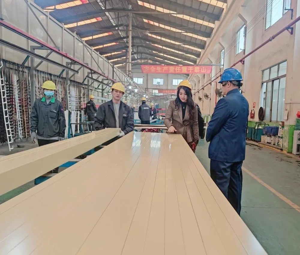 剛抵達高登,貴州省考察組領(lǐng)導(dǎo)一行不顧旅途勞累,在集團總裁李婧帶領(lǐng)深入到高登廠區(qū)內(nèi)進行實地考察。在高登各部門負責(zé)人的陪同下,分別參觀了生產(chǎn)車間、高登戶外系統(tǒng)產(chǎn)品、系統(tǒng)門窗展廳、鋁梯制造車間以及成品組裝車間等,深入了解高登的運作模式與策略、廠房結(jié)構(gòu)、生產(chǎn)制造等方面情況,領(lǐng)導(dǎo)們對高登的規(guī)模及產(chǎn)品創(chuàng)新紛紛點贊,特別是對高登的企業(yè)文化及高登以鋁代木3·12森林保護日的倡議給予高度贊揚。